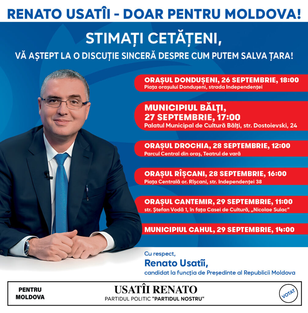 Candidatul la funcția de președinte al Republicii Moldova din partea Partidului Nostru, Renato Usatîi, va continua seria întâlnirilor directe cu locuitorii din întreaga țară. Aceste întâlniri reprezintă o oportunitate pentru cetățeni de a adresa întrebări, de a afla mai multe despre viziunea și programul candidatului, precum și de a discuta despre problemele comunității lor și […]